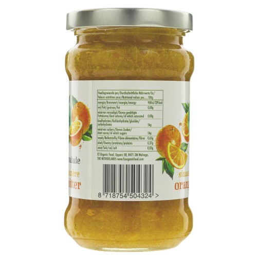 Organic Sugar, Organic Seville Oranges, Gelling Agent: Pectin, Acidity Regulator: Citric Acid. Prepared with 25g of fruit per 100g.